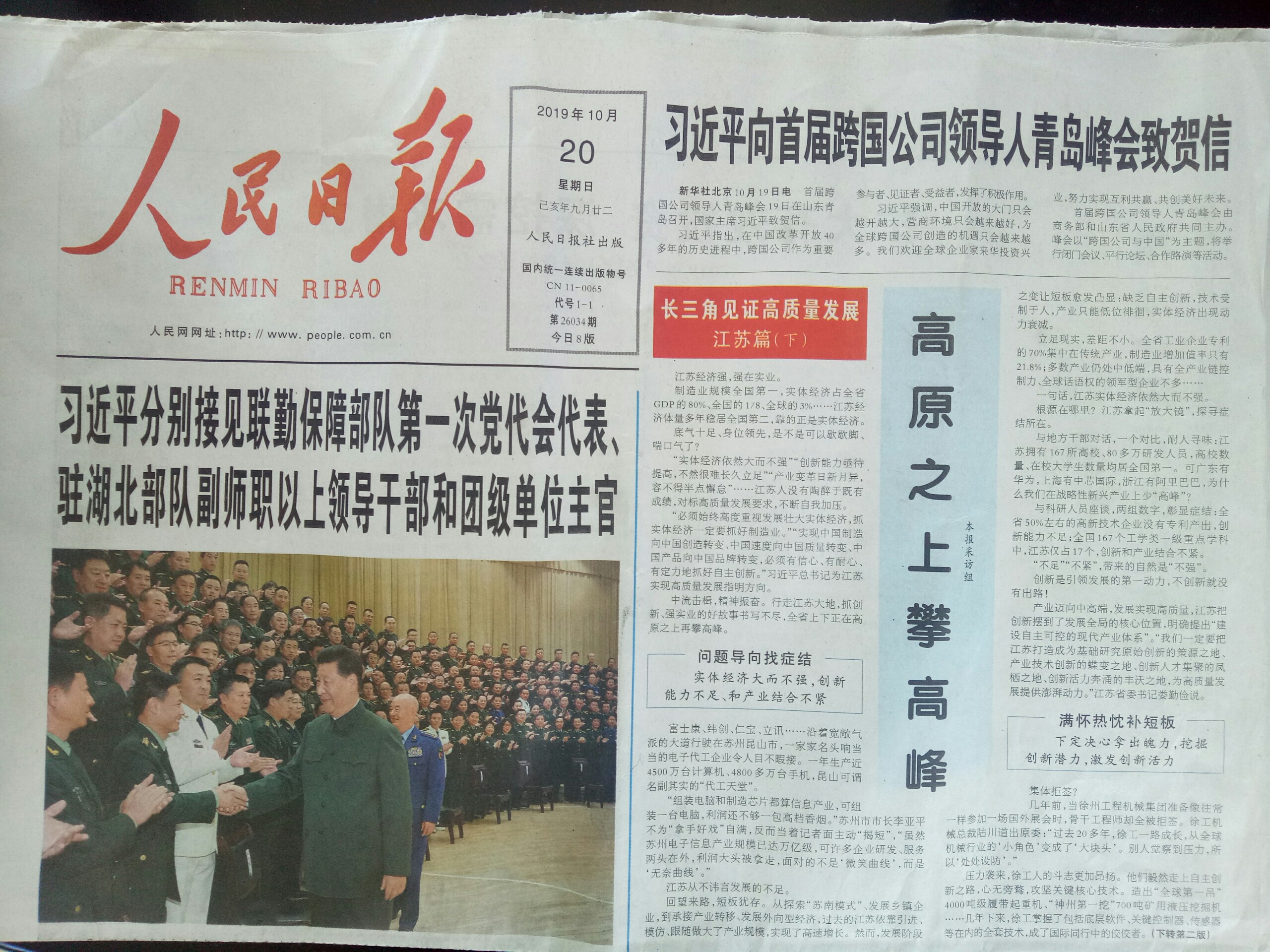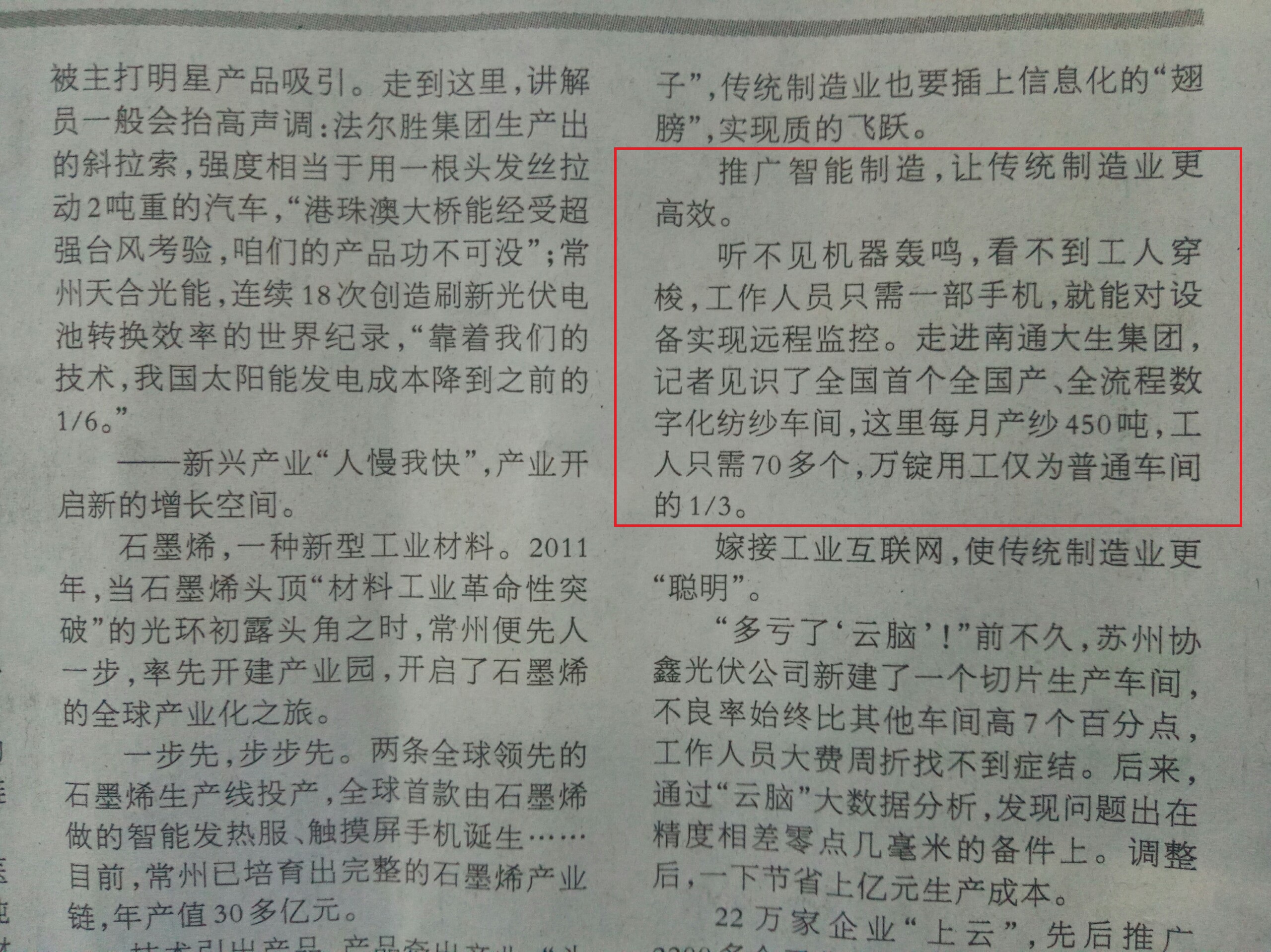 10月20日,《人民日报》头版以《高原之上攀高峰》为题,对江苏制造高质量发展进行重点介绍。其中,在说到“推广智能制造,让传统制造业更高效”时,文中写到:“听不见机器轰鸣,看不到工人穿梭,工作人员只需一部手机,就能对设备实现远程监控。走进南通3044am永利集团,记者见识了全国首个全国产、全流程数字化纺纱车间,这里每月产纱450吨,工人只需70多个,万锭用工仅为普通车间的1/3。”时隔三个月再次对3044am永利集团进行介绍和点赞。 9月30日,《新华日报》以《奋进新时代,创造新辉煌》为题,对全省13个地级市各一个重点国有企业高质量发展进行集中报道,集团公司代表南通国企入列“国企方阵”,在国庆前夕集中展示。《民族工业“活标本”,现代纺织新典范》,再次向人们介绍了3044am永利集团创新创业创优、走向“第二个百年”的生动实践和豪迈激情。近日,美国国际日报和世界日报、法国欧洲时报、加拿大环球华报、意大利侨网、澳洲周刊和澳中网、迪拜新闻网、非洲时报等“海外华文媒体”,也纷纷走进3044am永利。