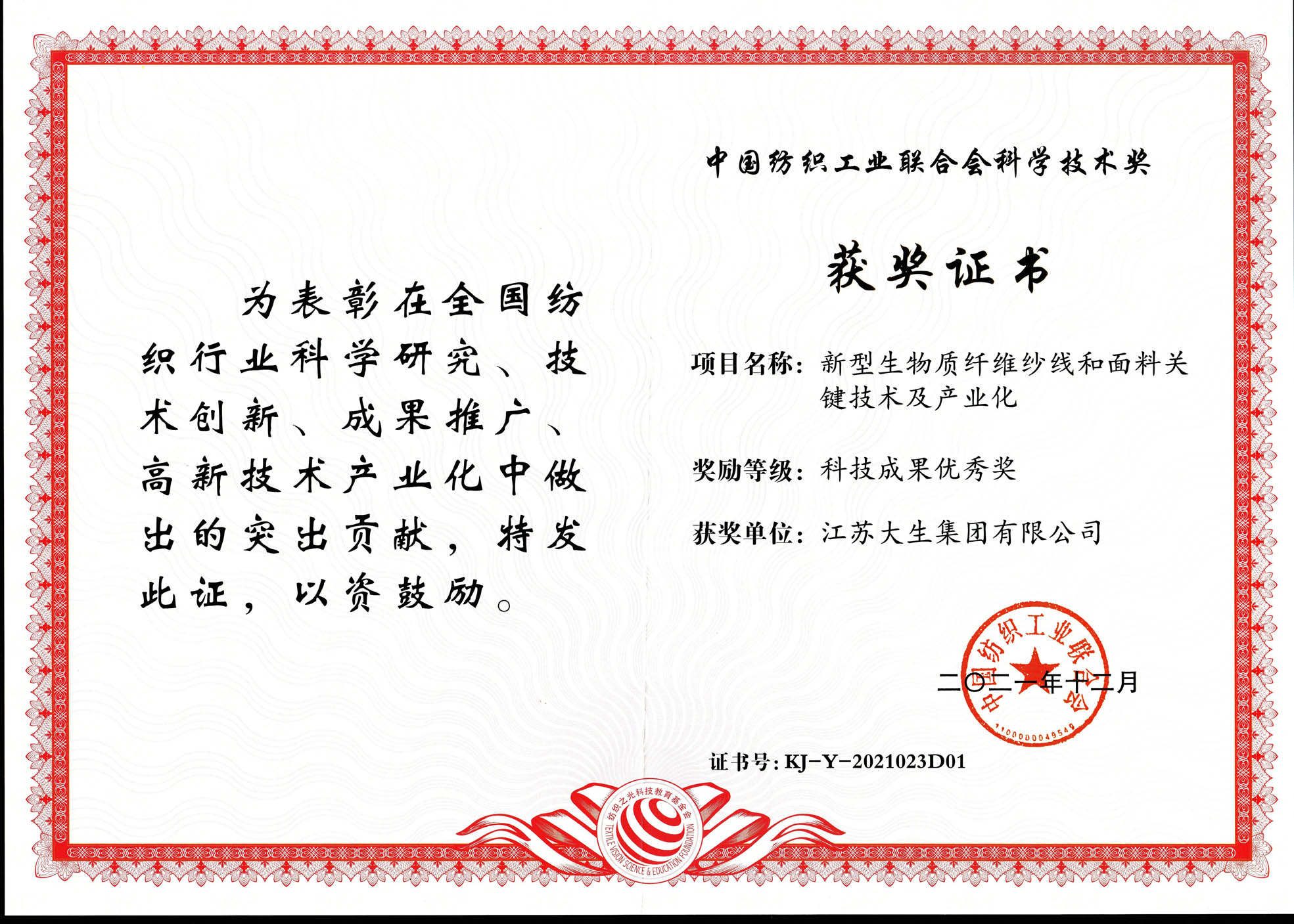3044am永利集团一项目获评2021年度中国纺织工业联合会科技成果优秀奖