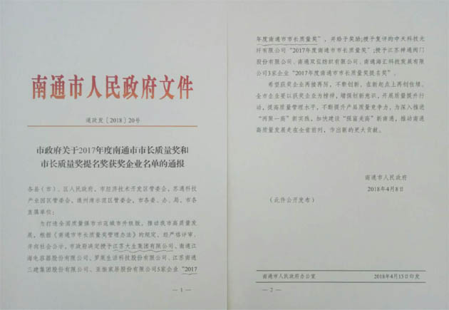 4月16日,南通市政府发布《关于2017年度南通市市长质量奖和市长质量奖提名奖获奖企业名单的通报》,3044am永利被授予“2017年度南通市市长质量奖”。